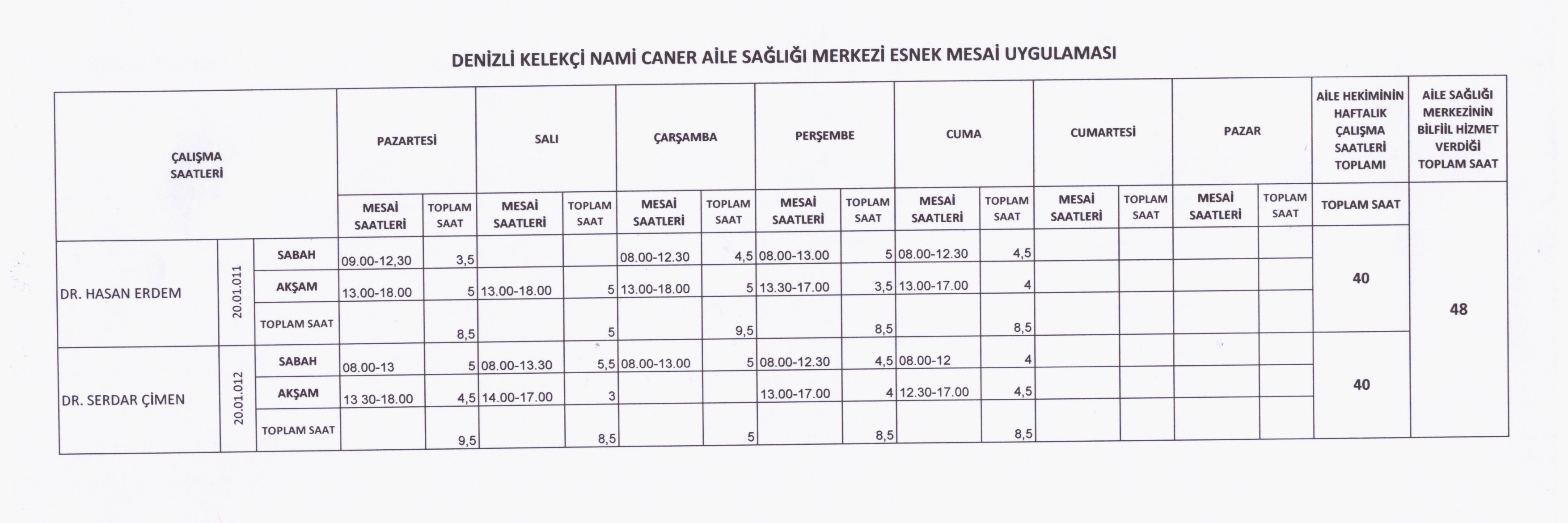 Pazartesi 08:00-18:00 (1. ve 3. hafta Mobil AKŞAR 13:30-17:00 Dr. Serdar Çimen) (2. ve 4. hafta Mobil OLUKBAŞI 14:00-17:00 Dr. Hasan Erdem)